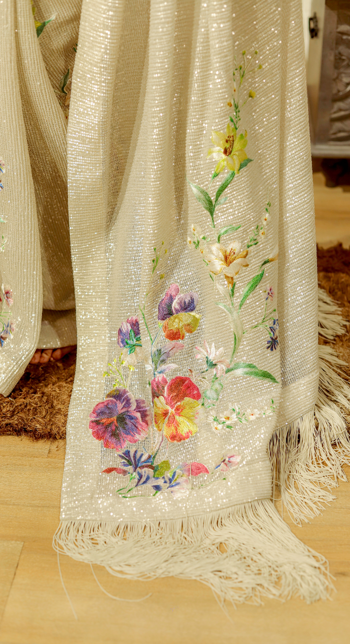 Ivory Color Elegance reflects serenity in simplicity. Adorned with delicate floral machine embroidery, this white-toned outfit exudes sophistication, perfect for engagement ceremonies and elegant soirées.
