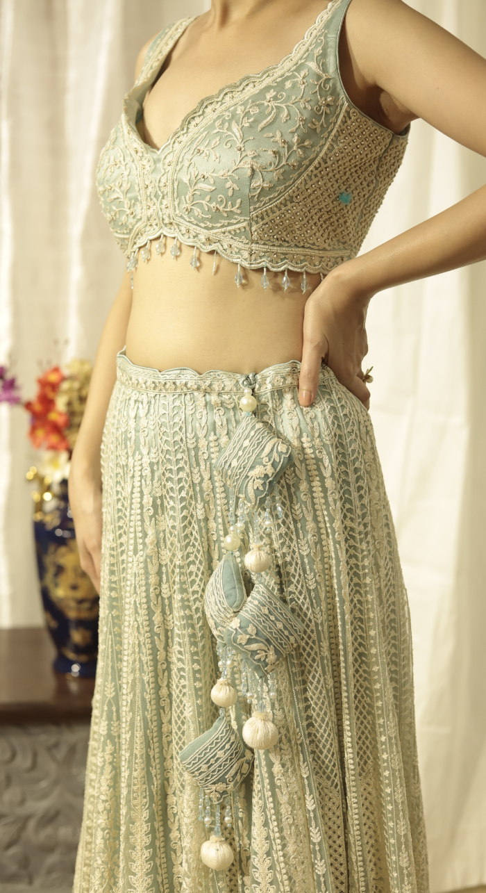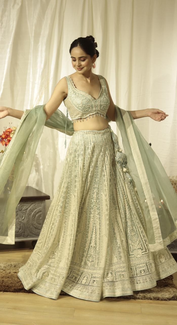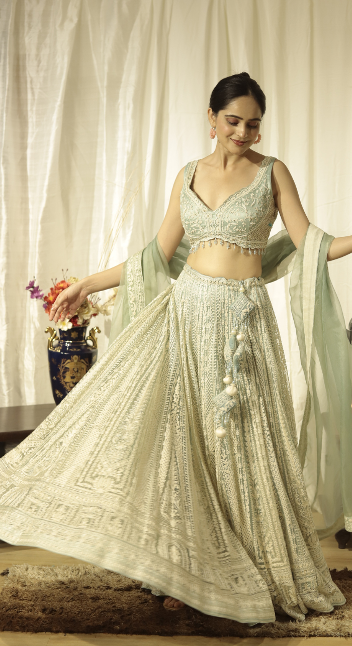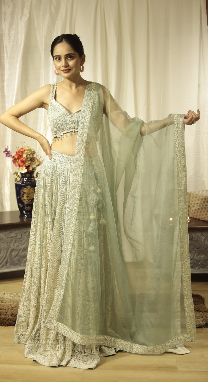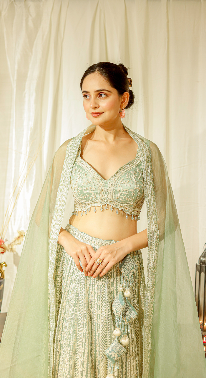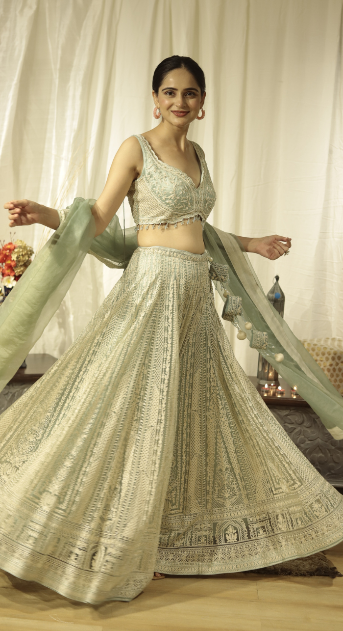 Designed for the modern traditionalist, Light Pista Elegance features net thread embroidery, moti accents, and hand embroidery on the blouse. The light pista hue and sumptuous lining create a graceful yet contemporary silhouette.