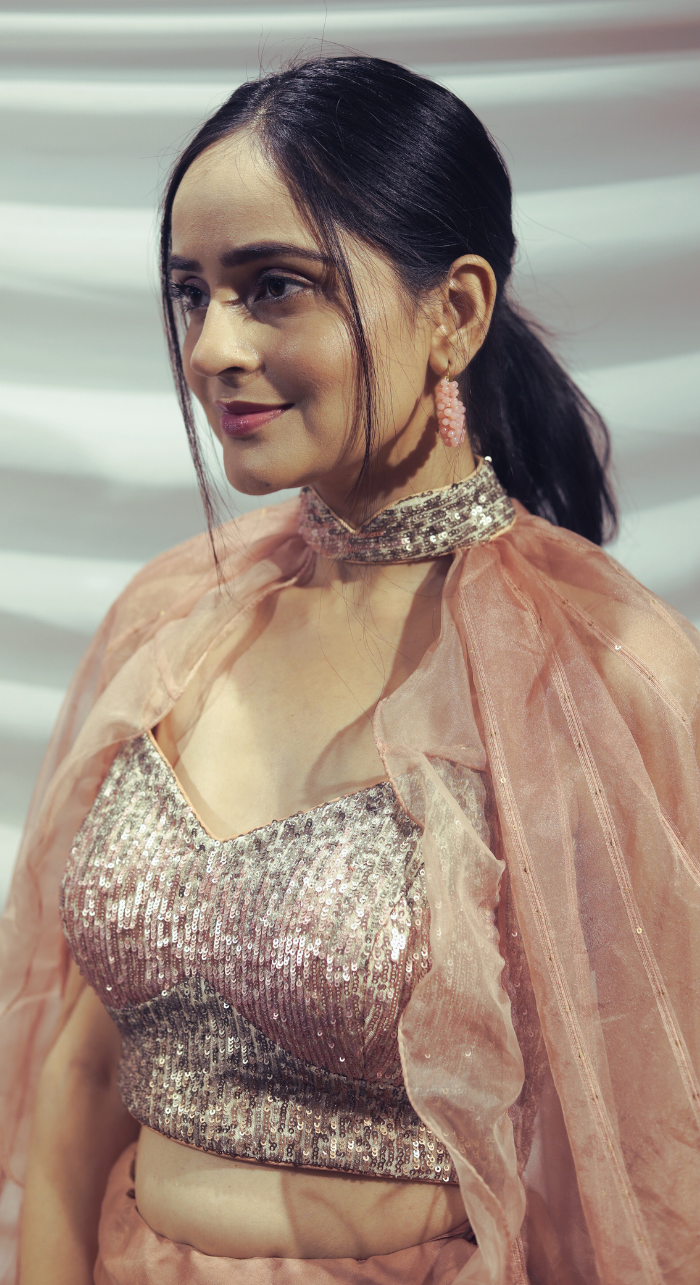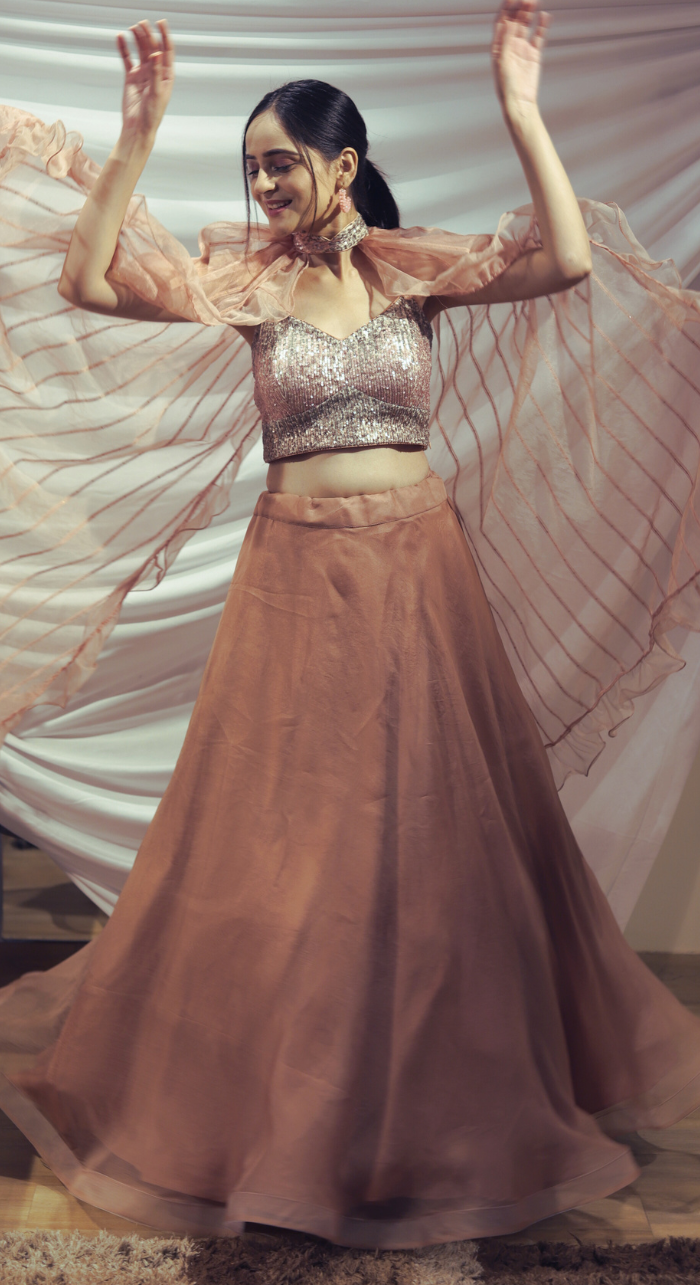Radiating grace in peach tones, Rosé Elegance is adorned with sequins work on a beautifully tailored blouse and a voluminous skirt finished with cancan. Its crepe lining ensures comfort, while the subtle shimmer makes it a statement piece for weddings and gala events.